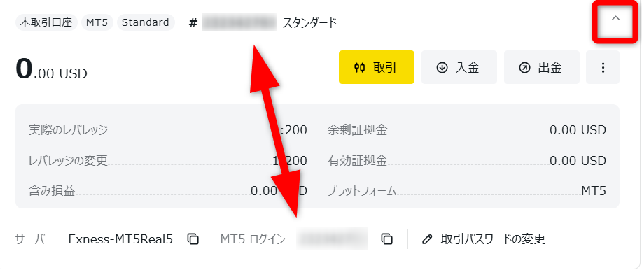また、口座情報の右上にある「」ボタンを押すことでより詳しい口座情報を確認でき、その下部にある「MT5 ログイン(MT4 ログイン)」からも口座番号を確認・コピペ可能です。