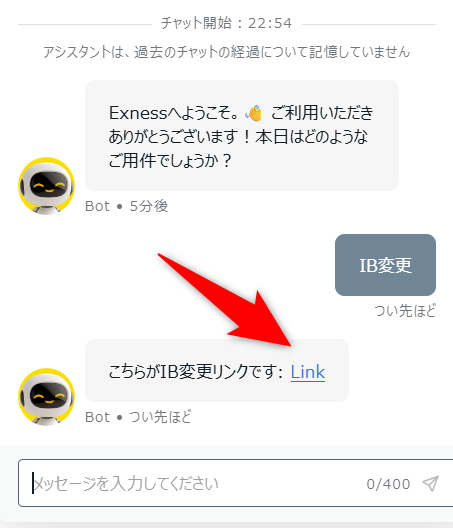 ライブチャットが開いたら「IB変更」とだけ送信します。