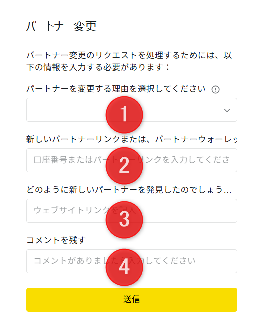 ①を選択し、②の欄にパートナーリンクをコピペしたら「送信」ボタンを押しましょう。