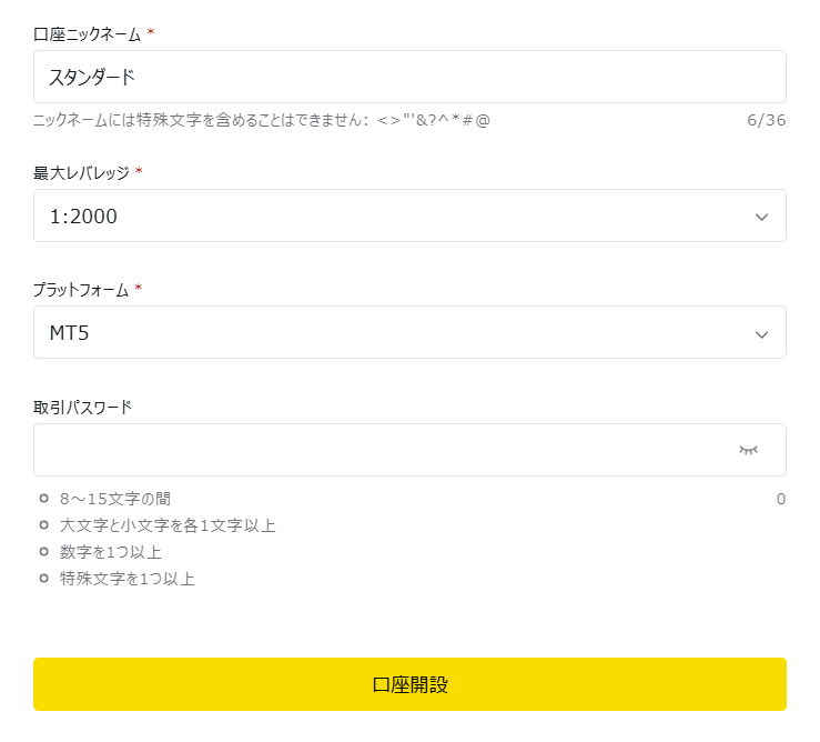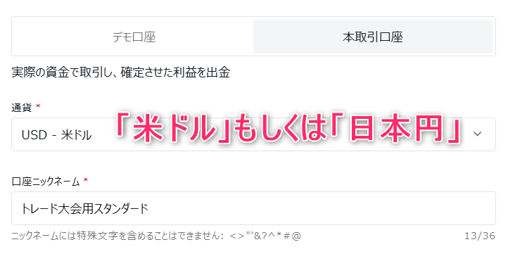 口座のニックネームはそのままでも問題ありませんが、例えば「トレード大会用スタンダード口座」などと設定するとわかりやすくておすすめです。